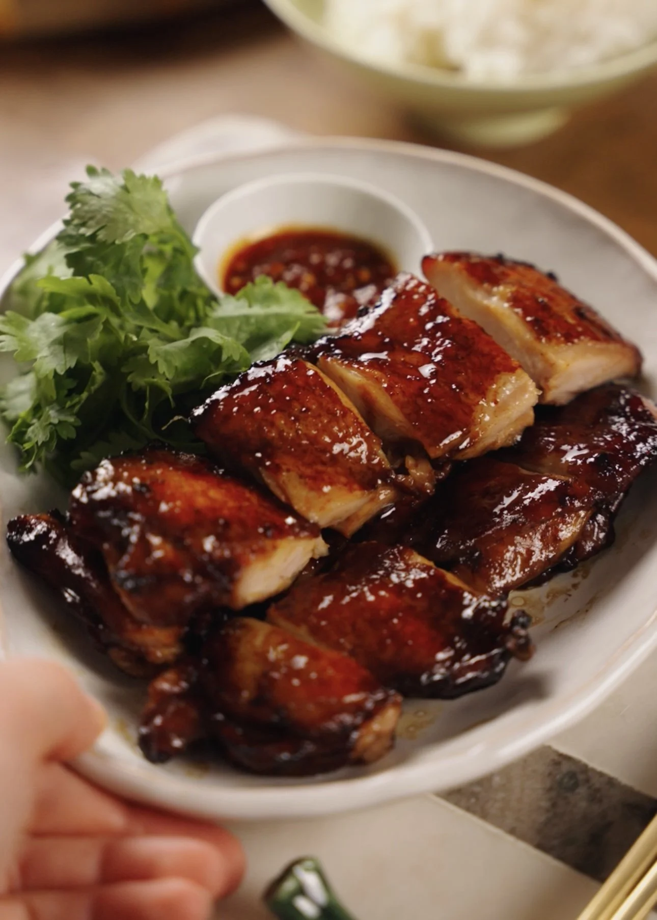 Allow the chicken to cool slightly before cutting to bite sized pieces. Brush with sauce/juices left in the baking tray. Pair with freshly steamed white rice and spicy sambal.
